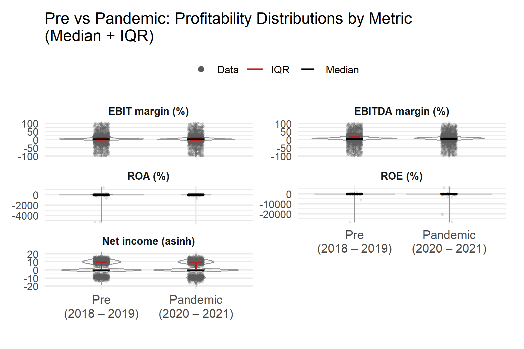 The results indicate that some industries experienced meaningful changes in within industry structure after 2020. Changes in clumpiness and outlying behaviour suggest increased dispersion and the presence of distinct firm level outcomes inside the same sector. In contrast, industries with stable scagnostic profiles show a more consistent liquidity profitability relationship through the pandemic window.