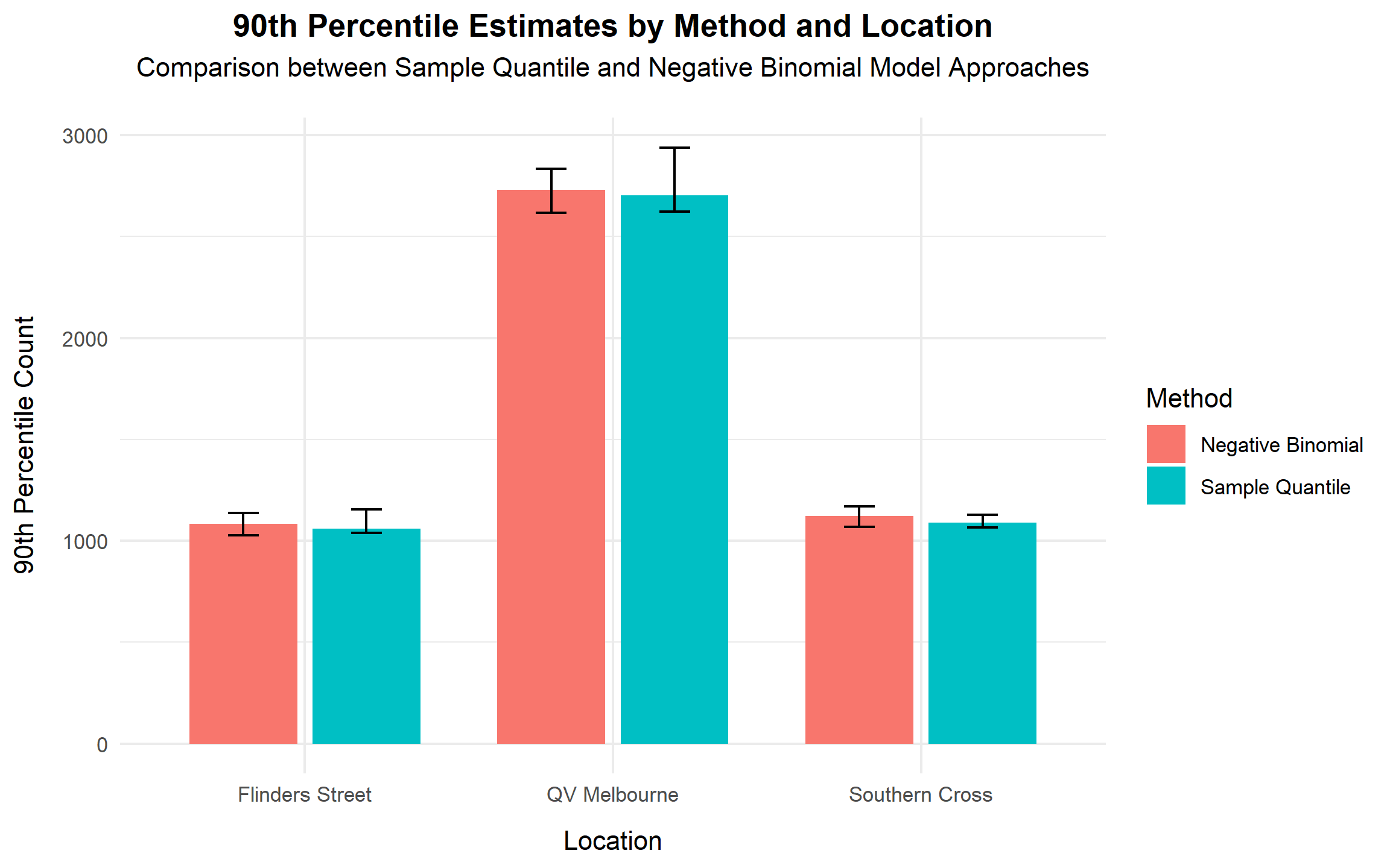QV Melbourne records the highest average pedestrian count (mean ≈ 2337), substantially exceeding Southern Cross (≈ 942) and Flinders Street (≈ 893). Measures of spread also differ notably, with QV Melbourne exhibiting the largest standard deviation. Importantly, the variance-to-mean ratio is well above 1 for all locations, indicating strong over-dispersion. This violates the Poisson assumption of equal mean and variance and suggests that a Negative Binomial specification may be more appropriate.