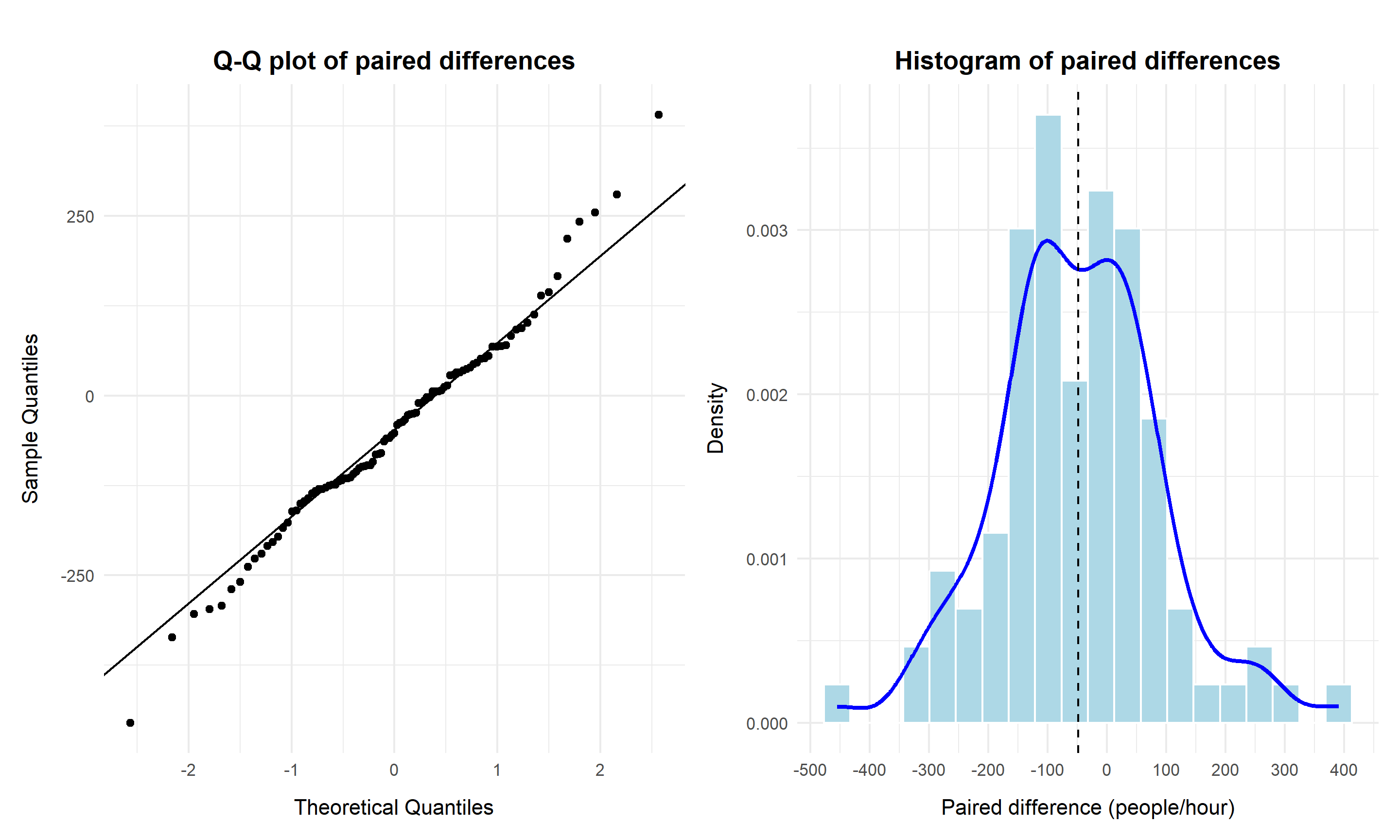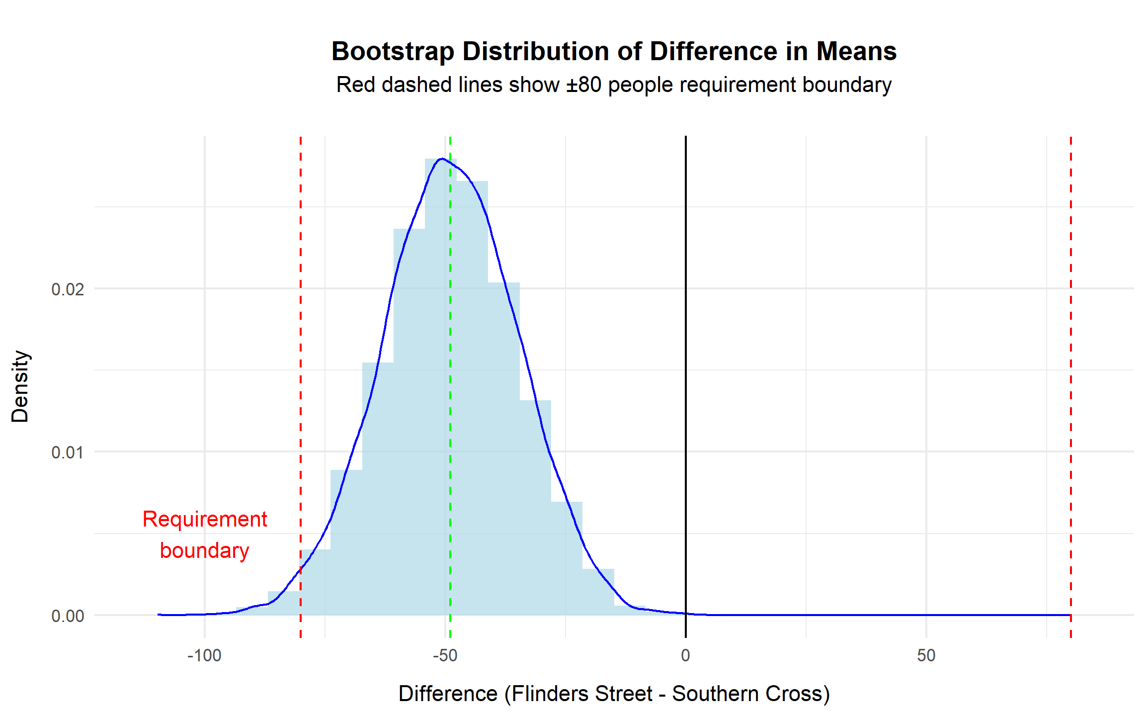 Statistical testing confirms that the difference in average pedestrian flow between Southern Cross Station and Flinders Street Station is small and well within the engineering tolerance of 80 people per hour. This supports the use of a single crossing design for both stations without compromising safety or capacity. Diagnostic checks further show that pedestrian counts exhibit substantial over dispersion, making simple Poisson assumptions unsuitable. A Negative Binomial model is therefore adopted throughout the analysis to obtain valid estimates and uncertainty measures.