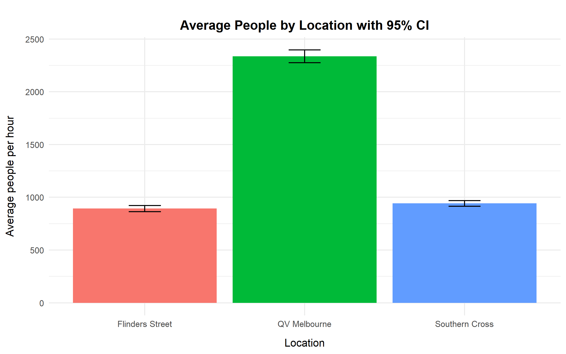 The results show that QV Melbourne consistently records the highest pedestrian volumes, with an average of approximately 2,300 people per hour. Its pedestrian flow is not only higher than the two railway stations but also more variable, indicating greater exposure during peak periods. In contrast, Southern Cross Station and Flinders Street Station have much lower and relatively similar average pedestrian counts, both remaining below 1,000 people per hour.