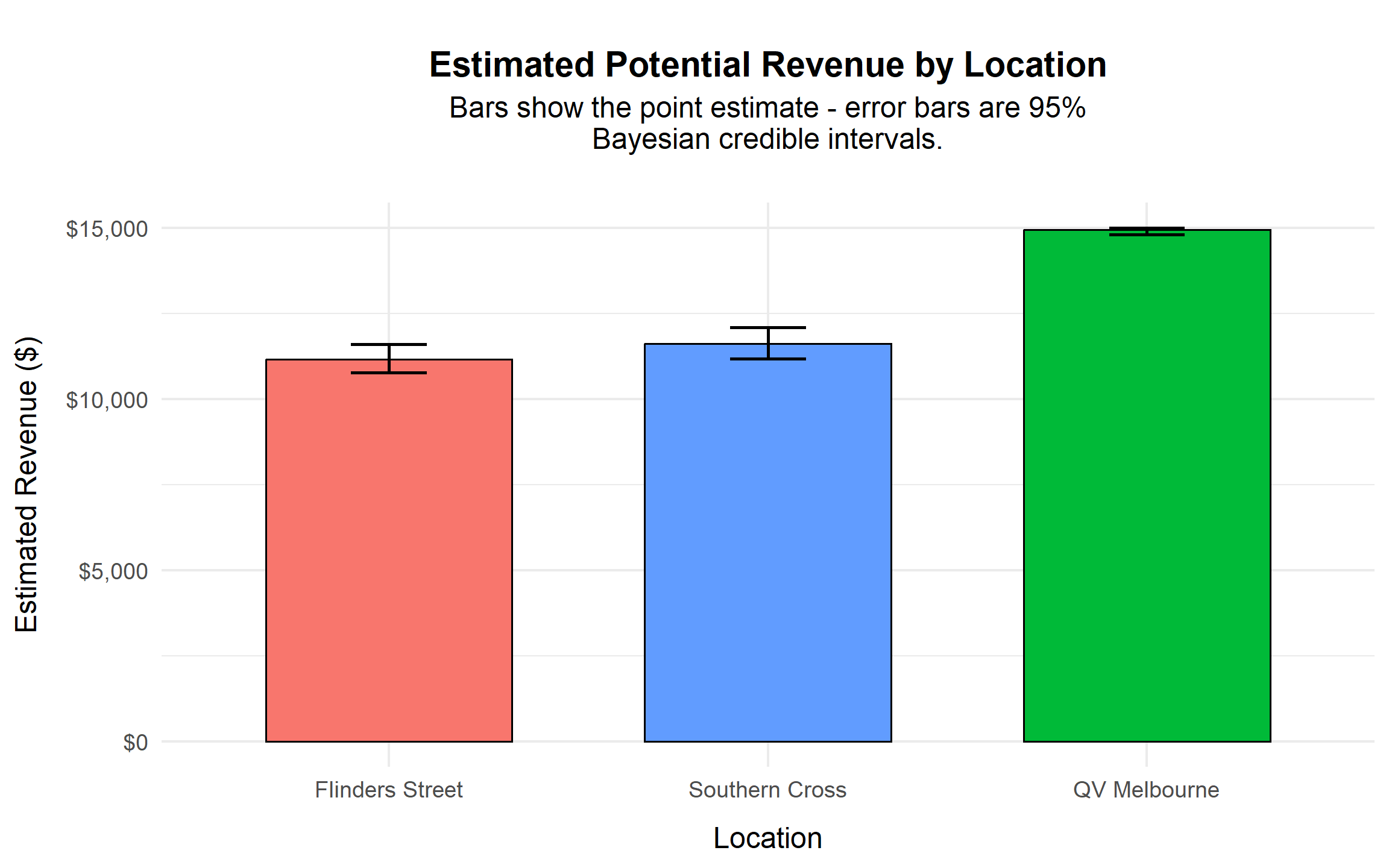 Southern Cross and Flinders Street generate similar expected revenues in the $11,000–$12,000 range, with overlapping credible intervals indicating comparable performance levels.