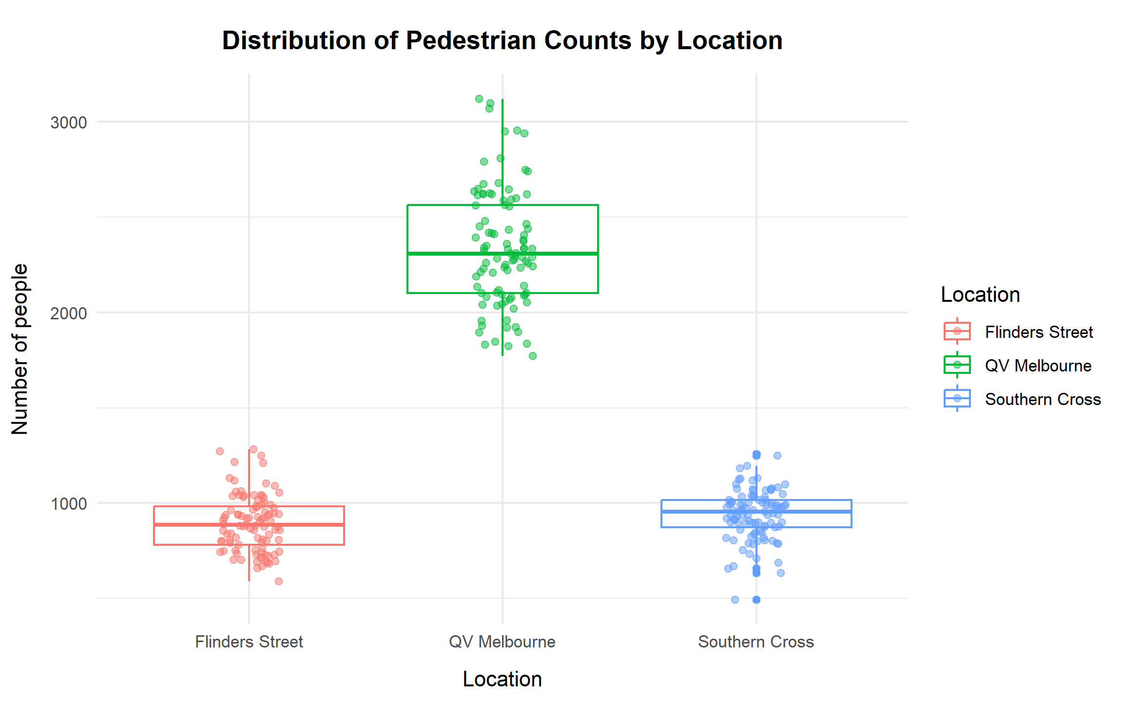 The boxplots indicate that QV Melbourne consistently records the highest pedestrian volumes, with counts concentrated in the low-to-mid 2000s and several high-traffic days exceeding 3,000. In contrast, Flinders Street Station and Southern Cross Station exhibit substantially lower medians, both below 1,000. The jittered observations reveal that Southern Cross includes several unusually low-count days, confirming the presence of outliers. Overall, QV Melbourne demonstrates both the highest typical volume and the greatest variability among the three locations.