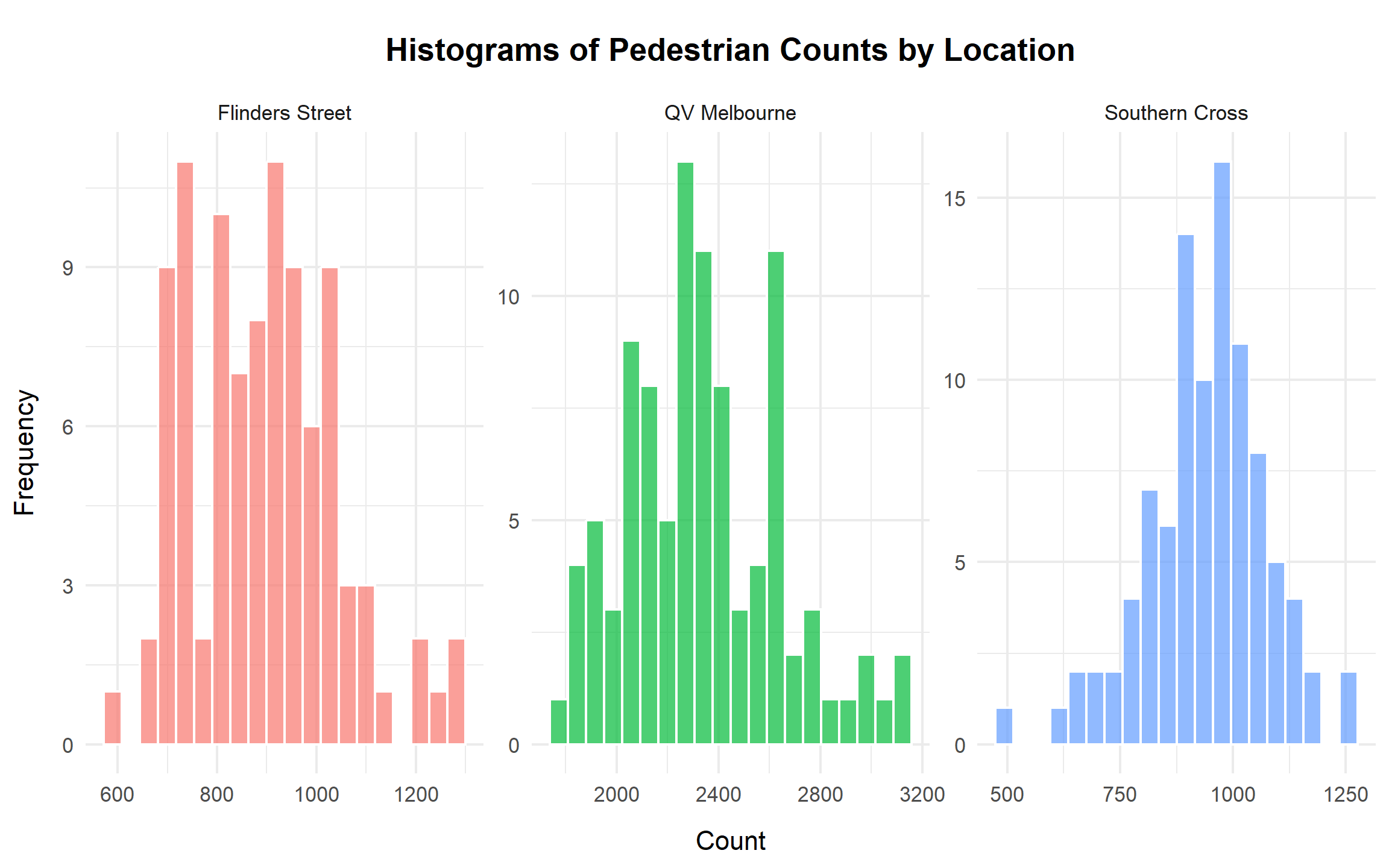 The histograms further highlight differences in distributional shape. Flinders Street Station is tightly clustered between approximately 700 and 1,100, reflecting relatively stable but lower foot traffic. QV Melbourne centres around approximately 2,300, with a broader range extending well above 3,000, indicating both higher demand and greater volatility. Southern Cross lies between these two in terms of central tendency but exhibits occasional low-count days consistent with the boxplot findings. These distributional patterns suggest that variability differs substantially by location.