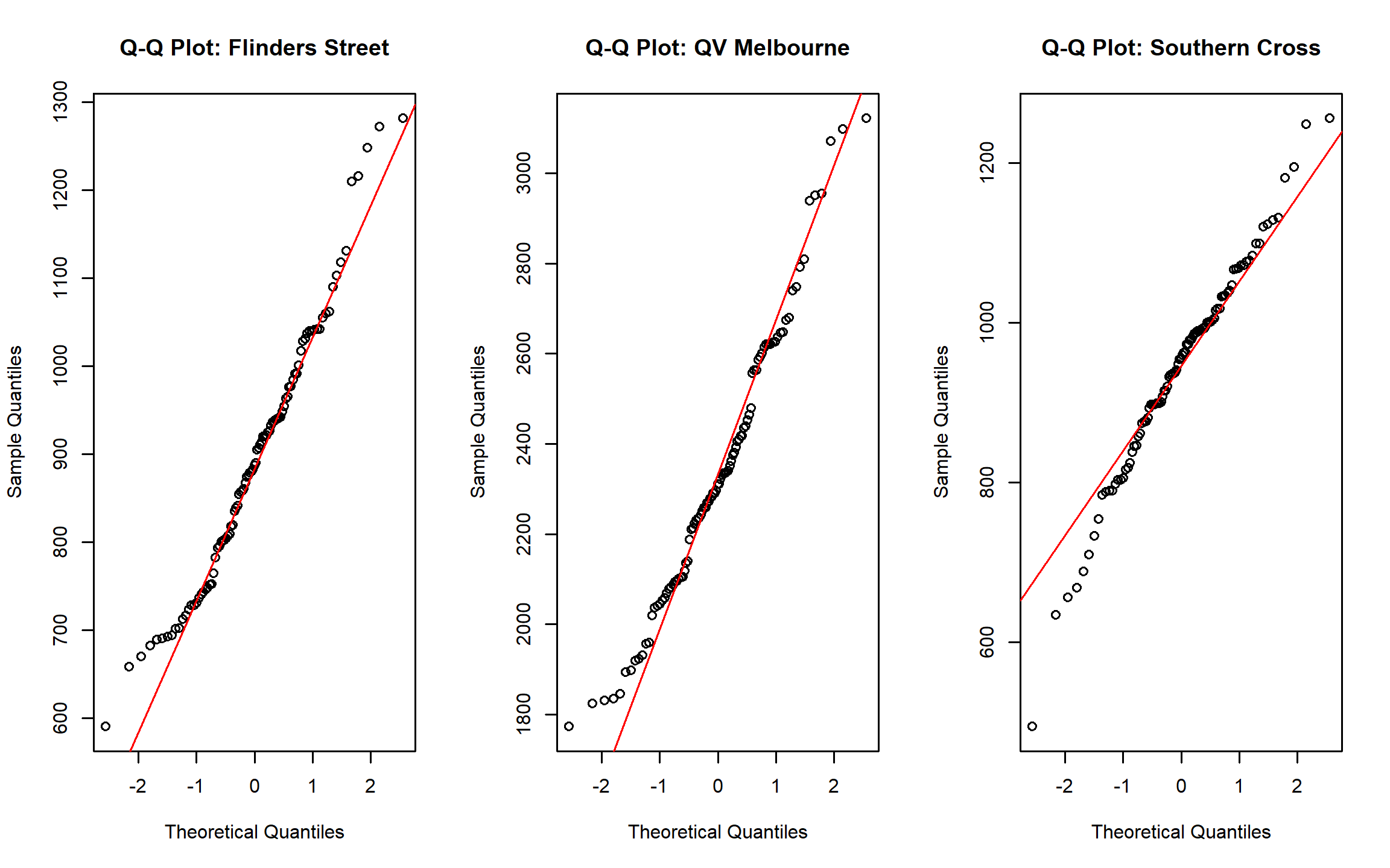 Across all three locations, the central portions of the distributions align moderately well with the reference line, while clear deviations occur in the tails. QV Melbourne exhibits the widest departures, consistent with its higher variability. These patterns indicate that normal-based inference would underestimate tail risk, reinforcing the need for count-based modelling approaches.
